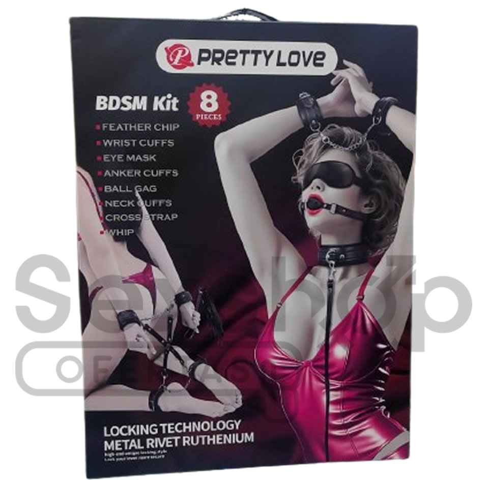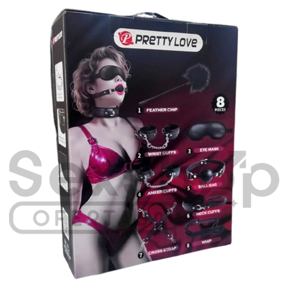 Este objeto es un kit de iniciación al bondage de la marca Pretty Love, diseñado para juegos de pareja. Incluye 8 piezas esenciales como esposas para muñecas y tobillos, antifaz, mordaza de bola (ball gag), collar y látigo.