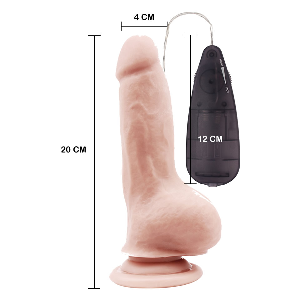 ¡Perfecto para una satisfacción verdaderamente gigantesca! Consolador de color piel con forma de pene realista. El consolador tiene un glande abultado, venas en el eje y testículos lisos. Este chico realista y abultado tiene modos de vibración placenteros, los modos se pueden controlar fácilmente con el control remoto conectado a un cable. La ventosa adicional hace posible la diversión con las manos libres.